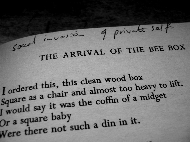 Rakastan Sylvia Plathin koko tuotantoa. Naputtelin paperille vanhalla kirjoituskoneella pätkän yhdestä lempirunostani ja jätin sanat siihen, koristamaan huonetta. Ostin edelliseltä Lontoon matkaltani käytettynä Sylvian runokokoelman "Ariel", jonka muutaman sivun reunaan edellinen omistaja oli raapustanut muistiinpanoja, analyyseja. Onko teissä Sylvia Plathin tuotantoon rakastuneita?